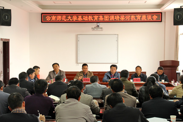 调研结束后,12月25日下午,在教育局会议室召开了调研座谈会。会上,梁河县教育局局长余文龙汇报了2015年梁河县教育工作开展情况。政协副主席尹自正、人大常委会副主任李继鸿分别就如何认真落实好云师大对梁河教育系统各项帮扶工作作了指导和要求。云师大基础教育集团总支书记、办公室副主任冯东黎就本次调研工作情况做反馈发言,对下一步教育帮扶的六个要点,两个层面做了介绍和说明;同时,他表示回去后将尽快形成调研报告,积极向学校领导汇报,认真制定科学有效的帮扶方案,争取在2016年3月份新学期开学全面启动帮扶工作。县政府副县长景智富全面分析了我县教育发展的现状,从四个方面就如何抓好教育,推进教育发展提出了要求:一是转变观念,发挥特长,改革创新;二是强化学习,博采众长,补足短板;三是上派下挂,借鉴经验,推动发展;四是加强汇报,“拉帮结伙”,合力攻坚,形成一种大办教育的格局,促进梁河教育跨越发展。