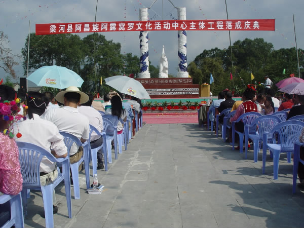 梁河县长方文信代表县委、县人大、县政府、县政协致欢迎辞,他说,阿昌族是一个勤劳、善良、直爽的民族,是全国22个人口较少民族之一,阿昌族有语言而无文字,但有着情节生动、风格别致、可诵可唱的诗歌、神话、故事、传说、戏剧等丰富的民族民间文化。目前,全国阿昌族人口共有3.5万人,其中13882人在梁河,占全国阿昌族人口比例的39.6%,全国有三个阿昌族乡,其中有两个在梁河。1993年,德宏州第九届人大常委会第三十次会议做出了《关于统一阿昌族节日名称和时间的决定》,正式将陇川县阿昌族的“会街节”和梁河县阿昌族的“窝罗节”统一为“阿露窝罗节”。由于梁河经济、社会发展相对滞后,特别是阿昌族地区人民群众的生活居住条件较差,受交通闭塞、文化落后等客观因素制约,阿昌族传统民族节日“阿露窝罗节”活动无固定场所,每年的庆典活动都要筹措资金投入搞临时场地和标志建设,投入了大量的人力、物力,而且效果不是很好。阿露窝罗文化活动中心主体工程的落成,可以满足全县阿昌族人民举办传统节日和各类中型活动的需要,更为重要的是有利于发展民族旅游,弘扬民族文化,繁荣民族经济,加强各民族间的沟通和交流。它的建成,对拓展梁河县旅游业发展的空间,繁荣民族文化和促进经济发展,将具有重大的战略意义。