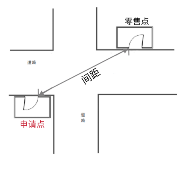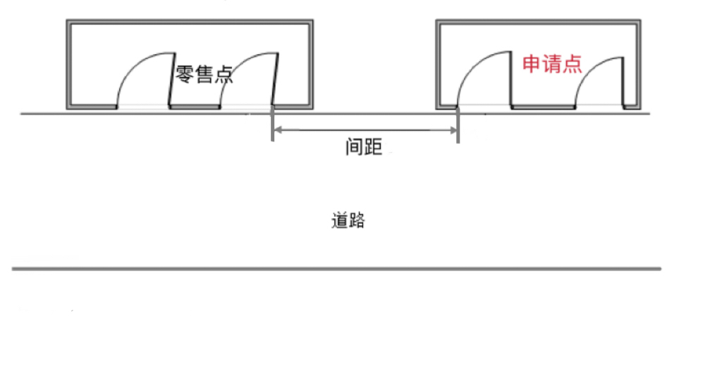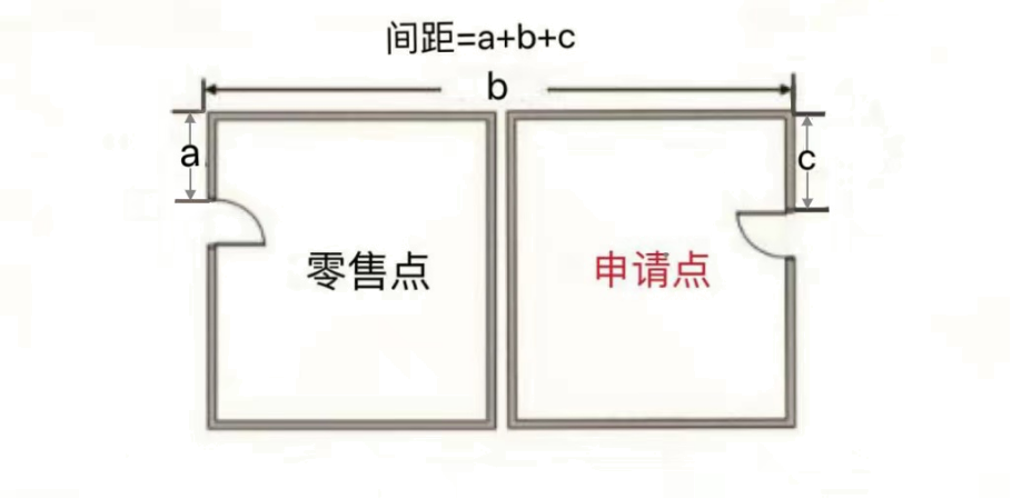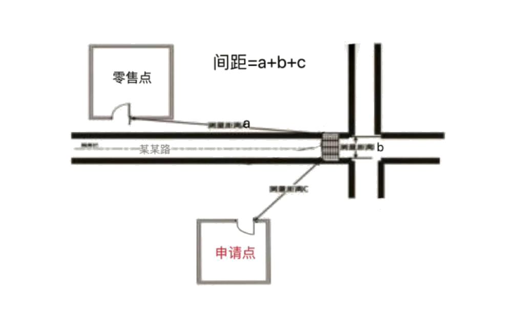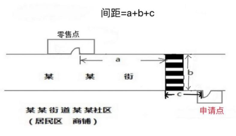 (三)“零售点间距”是指申请点与参照零售点(周边已设最近的零售点)之间按“门边到门边”原则进行测量。测量数据精确到小数点后一位,如“30.0米”或“100.0米”。
