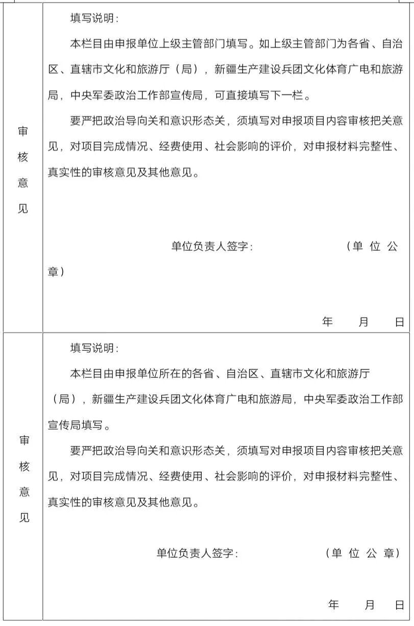 2.各省、自治区、直辖市文化和旅游厅(局),新疆生产建设兵团文化体育广电和旅游局,中央军委政治工作部宣传局应严格落实意识形态工作责任制,对本地区、本系统美术馆申报项目的内容和申报材料的真实性、完整性、规范性进行审核把关,须填写明确的审核和推荐意见并加盖公章。