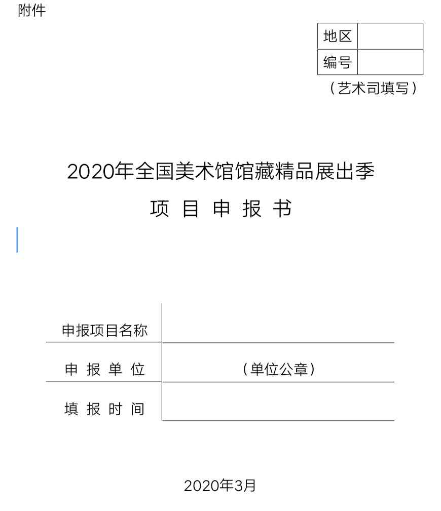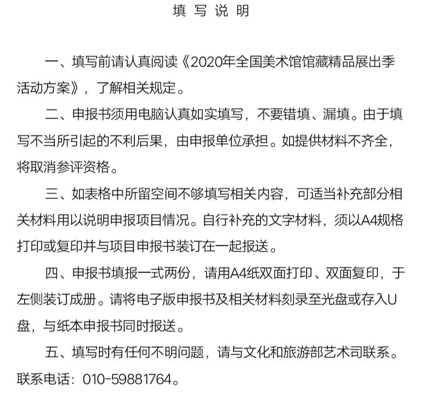 (一)美术馆应认真填写《2020年全国美术馆馆藏精品展出季项目申报书》(见附件),并根据申报书要求提供相关资料。该申报书电子版可从文化和旅游部政府门户网站(https://www.mct.gov.cn/)首页—信息发布—公告通知栏目下载。