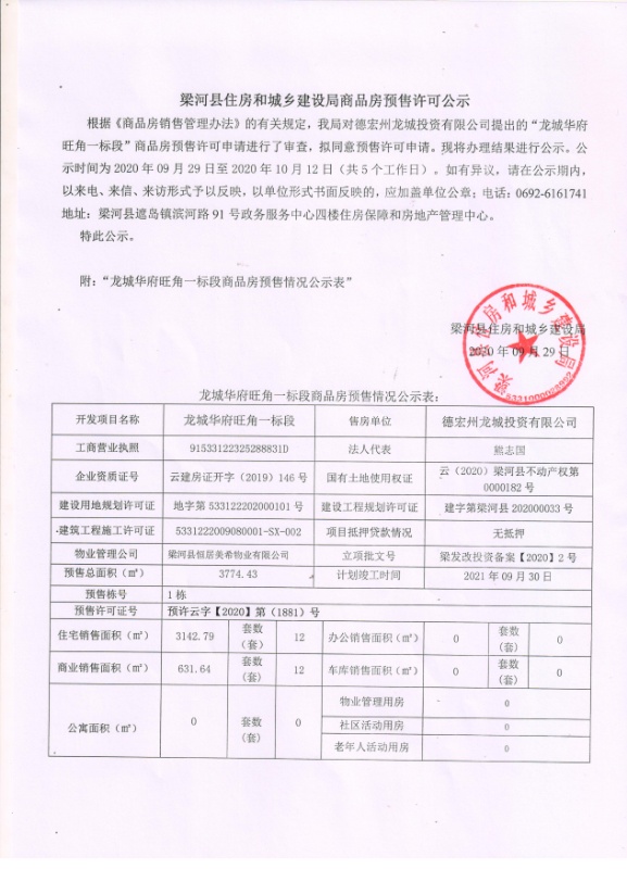关于梁河县龙城华府旺角一标段商品房预售许可公示