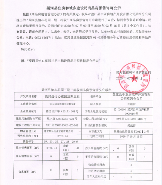 梁河县关于盈江县中亚房地产开发有限公司梁河分公司梁河县怡心花园三期三标段商品房预售许可申请的公示