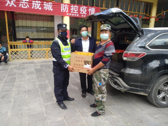 退休党员孟元富将方便面和自己种的桔子送到勐养堵卡点、镇野鸭塘和帮歪堵卡点;