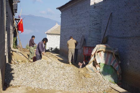 图为新搬迁来的村民在自力更生搞建设