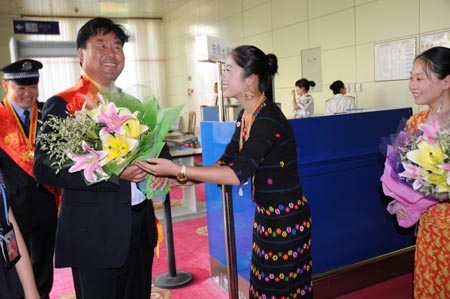 4月28日,在鲜花与掌声的包围中,到北京人民大会堂参加2010年全国劳动模范和先进工作者表彰大会的潘宁和张宽才载誉归来。