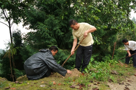 杨书记和其他党员干部一下车,立即就和勐竜村的党员一道在公路沿线种起麻竹来。杨向宏书记手拿锄头打坑塘,勐竜村党支部书记蒲正生紧随其后把竹苗栽好。县委办的党员和群众相互配合,你打坑塘,我栽竹苗,干得热火朝天。虽然天空不时下着小雨,但是,并没有影响到大家栽种竹子的积极性。而且,参与栽种竹子的人也越来越多,从开始的30多人逐步增加到80 多人。70多岁的老党员来了,入党积极分子来了,落选的村干部来了,还有不少的女党员放下家务活有说有笑、高高兴兴地把寄托着勐竜村群众致富希望的竹苗栽种好。经过半天的时间,绿油油的6000株麻竹苗在五一茶厂至勐竜村10公里长的公路沿线一株连一株地安下了新家。
