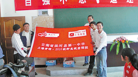 在仪式上,中国扶贫基金会代表赵阳女士介绍说,肯特公司在不断发展壮大的同时,积极参与各种社会公益活动,在全国很多地区资助了数百名品学兼优的贫困大学生完成学业,得到社会各界的广泛赞誉。此次在梁河一中实施资助家庭贫困高中生项目尚属首次。赵阳还介绍了扶贫基金会新长城这一项目实施的背景、原则及运行情况。上海肯特公司代表、工会主席孙海清向大家介绍了公司基本情况,与校方负责人共同为梁河一中“2010级上海肯特公司·新长城自强班”揭牌,并为自强班授班旗。