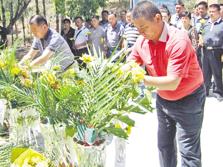 图为梁河县党员干部向杨善洲墓敬献花篮和鲜花