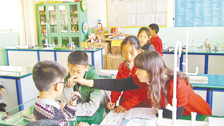 图为遮岛镇中心小学老师精心指导学生实验操作。(遮岛镇中心小学提供)