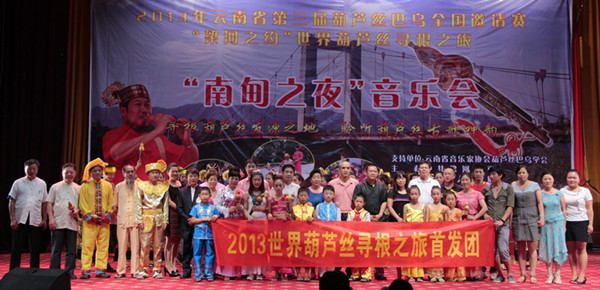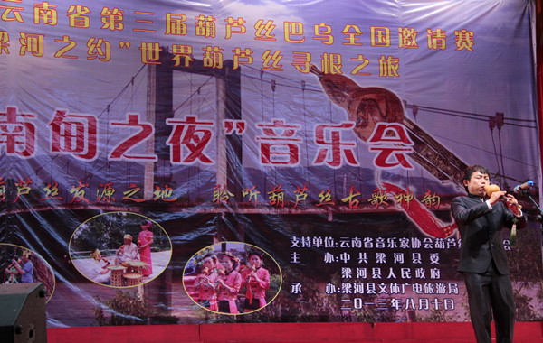 近日,在云南国际文化交流中心副秘书长邓宇宾及云南省音乐家协会葫芦丝巴乌学会副会长、秘书长冯晓黎率领下,云南、山东、安徽、河北、广东、海南、福建、浙江、深圳、厦门等地的葫芦丝音乐艺术家40多人齐集梁河,开展2013年云南省第三届葫芦丝巴乌全国邀请赛暨“梁河之约”世界葫芦丝寻根之旅主题活动。