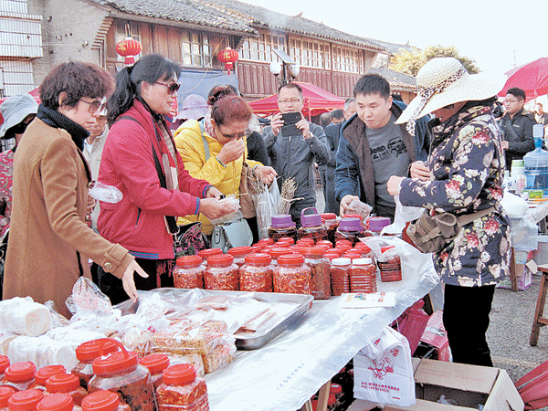 大年初一的九保街人山人海、水泄不通,稀豆粉粑粑、烧腊、火烧猪、松花糕、年糕、堆花雕酒、年枣糕、泡果子、豆类制品、各式烧烤等特色美食让许多游客大呼过瘾。