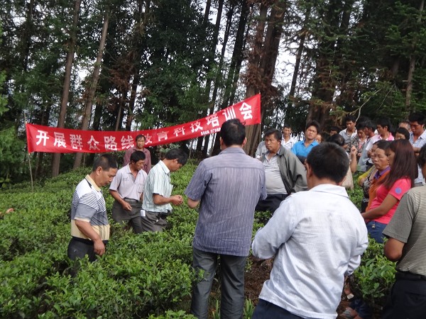 培训采取实践操作与理论讲解进行。上午,技术人员率领茶农直接到茶地里进行现场诊断、答疑、开“处方”:就茶园中耕、施肥、修剪、病虫害防治及鲜叶采摘中存在问题分别讲解、示范,让茶农更直观的学习茶叶管理技术。下午,在回龙寨活动中心召开理论培训会,技术人员分别就茶叶品牌建设、地理标识使用要求及科学管理茶叶作详细而生动的讲解。