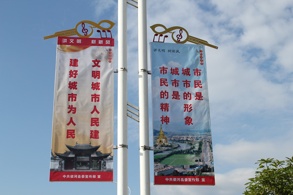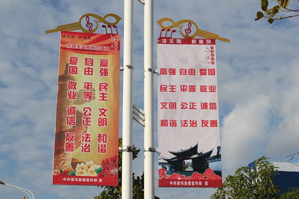 为营造全民讲文明树新风,积极践行社会主义核心价值观的浓厚社会氛围,在德宏州委宣传部的大力支持和帮助下,梁河县积极创新宣传方式,不断扩大社会主义核心价值观和文明创建的知晓率和参与度。近日,梁河县在龙窝大道两侧路灯杆上安装社会主义核心价值观宣传画688幅,对社会主义核心价值观进行全方位宣传,倾力打造社会主义核心价值观宣传景观大道。