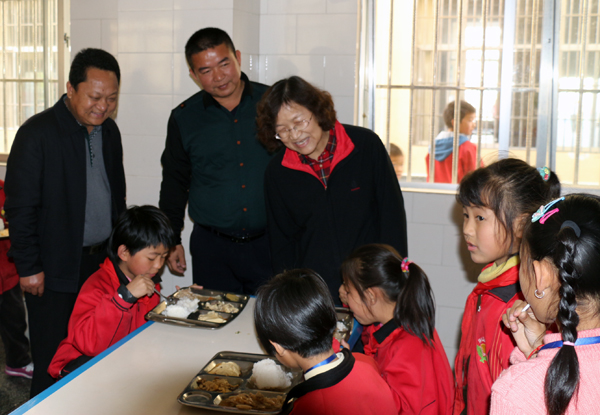 廖晓珊(右一)、张益伟(左一)到遮岛小学 食堂查看营养餐