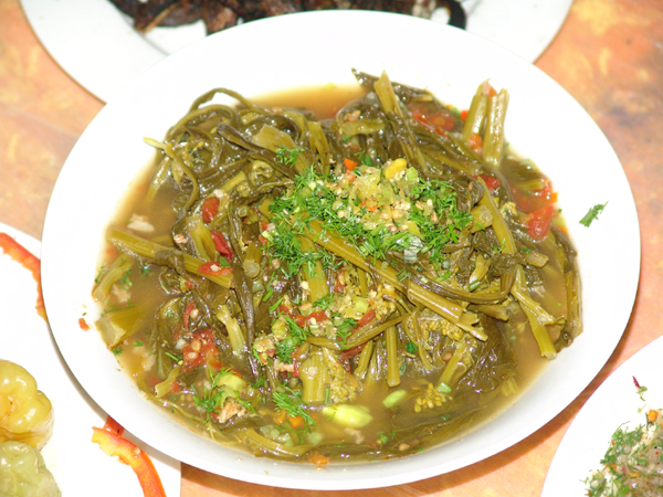 在傣味煮菜中,要数酸粑菜最好吃了。用青菜和西红柿、酸木瓜一齐用肉汤使劲煮,煮得青菜又酸又粑,吃时再放上一些生的小米辣、缅芫荽,准会令你胃口大开。