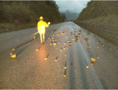 近期,K47+592处桥梁梁板重建,启用了临时便道通行。由于便道打通时日不久,山体石块存在诸多不稳定因素,暴雨冲刷无疑更令这一情况雪上加霜,大小石块不断滚落,将道路阻断,两边车辆无法通过,情况十分紧急。接到消息后,作为公路养护人员的我们第一时间到达现场,在所长杨建东的带领下兵分两队:一队在便道两端设置安全警示标志,疏导安抚被堵在路上焦虑不安的司乘群众;一队及时清除便道和附近路段的路面及边坡不稳定石块。