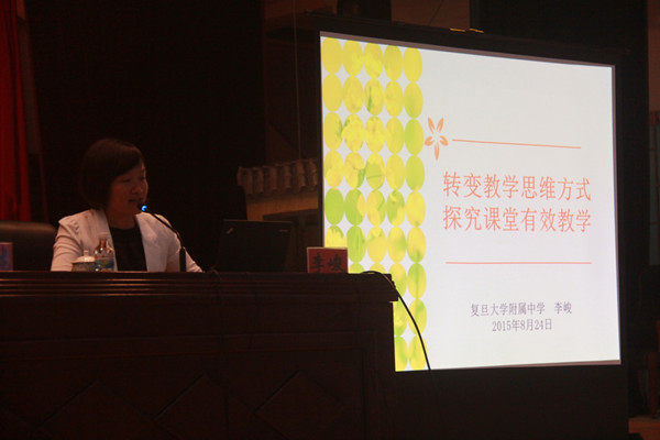 培训从复旦附中党委副书记、历史特级教师李峻的《转变教学思维方式 探究课堂有效教学》专题讲座正式开始。她从一个个生动、 有趣的例子,引入教育教学的规律,从自身体会及经验到教育理论科学知识的分析讲解,言简意赅、层次分明,深入浅出,分别论述了惯性思维对教育工作的影响,教师的经验性思维对教学的影响及不同思维角度对教育结果的影响等。结合上海市开展的中英教学对比交流活动情况进行了中英教学的对比,从与西方不同国家的教育对比分析了我国教育的现状,优势与不足;从有“备“而教,强调了”备“的重要性,从各个细节入手分析了教学思维方式转变的方法及实现有效教学的思路。最后从海豚集体捕鱼的故事强调了团队力量的重要性。