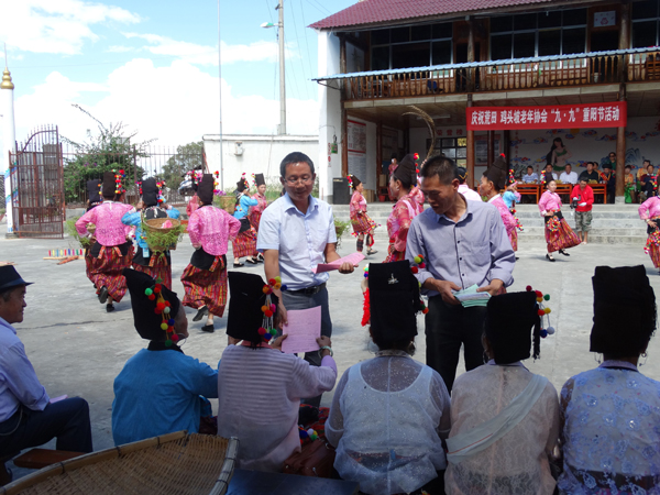 县委政法委副书记平学文代表县委政法委热烈祝贺荒田村举行九九重阳节活老年活动,同时希望老年同志们继续发挥余热,协助乡村开展好综治维稳平安创建、禁毒防艾和无邪教创建工作,带头遵守各项方针政,带头教育子女远离毒品拒绝邪教,为创建平安梁河和谐乡村做出积极的贡献.