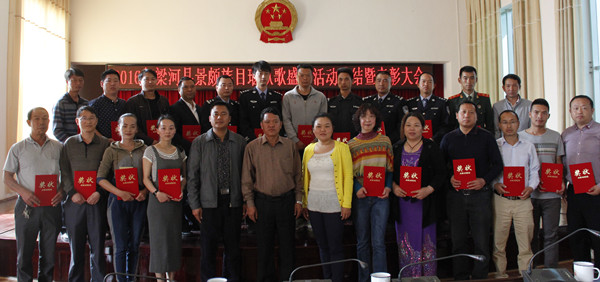 随后,梁河县2016年景颇族目瑙纵歌盛会组委会主席、县人大常委会主任石道竜,县委常委、宣传部长龚茂丹,副县长景智富为在2016年梁河县景颇族目瑙纵歌盛会期间工作成绩突出、表现优秀的杨荣道、黄艳萍等25名工作人员颁发了荣誉证书。