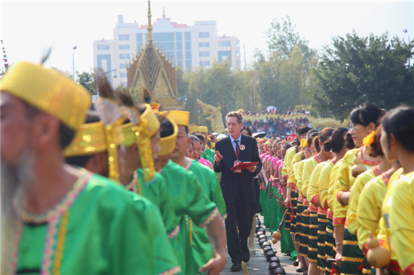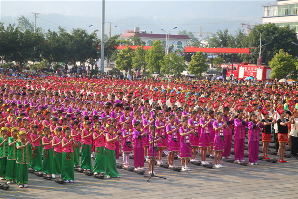 上午10时,杨森宣布申报开始。彼时,广场中央身着五彩民族服饰的1600余名各族学生和群众同时吹响葫芦丝,现场整齐演奏了《月光下的凤尾竹》和《傣家欢歌》两首葫芦丝曲目,场面恢弘壮观。音乐停止,现场爆发出雷鸣般的掌声,整个金塔广场沸腾了。认证官和公证员现场逐一清点了演奏人数,并对现场认证情况作了介绍。