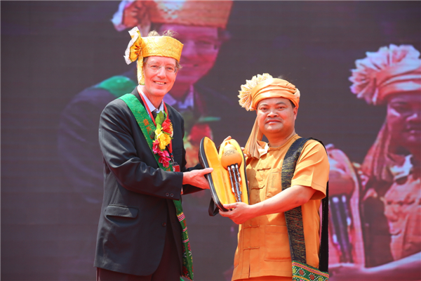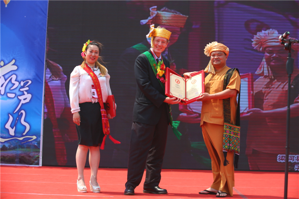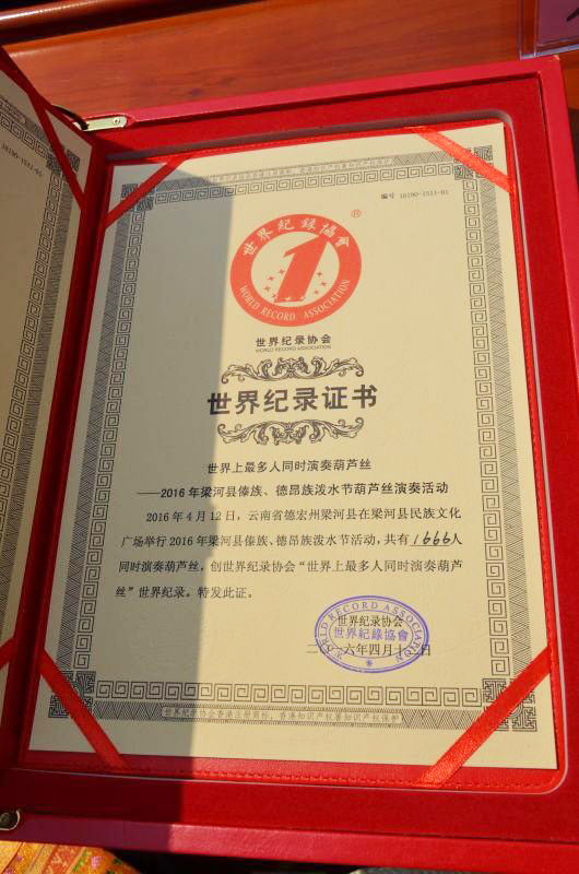 12日举行的泼水节开幕式上,世界纪录协会美国高级认证官麦克·温森特现场宣布了世界纪录协会认证结果,梁河县人民政府县长李奇接受了世界纪录协会颁发的认证证书,并向世界纪录协会赠送了梁河葫芦丝和葫芦丝同奏世界纪录纪念邮票。