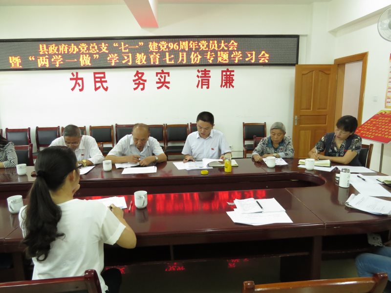 经政府办研究,于7月11日组织机关支部全体党员在县政府七楼会议室召开政府办机关党支“七一”建党96周年党员大会暨“两学一做”学习教育七月份专题学习会。