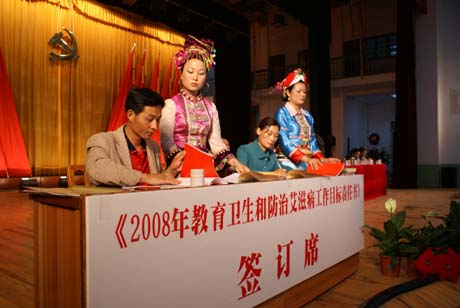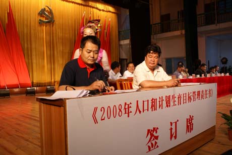 图为:县委、县政府与各乡镇签订了2008年《人口和计划生育目标管理责任书》