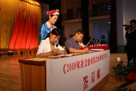 县委、县政府与各乡镇签订了2008年《社会治安综合治理责任书》、《人口和计划生育目标管理责任书》、《教育工作目标管理责任书》、《卫生工作目标责任书》、《防治艾滋病工作目标责任书》。