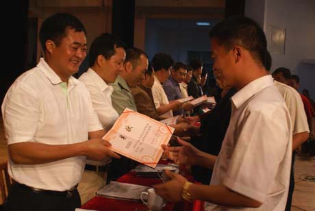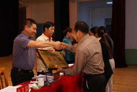 图为:与会领导为获得先进集体的单位和个人颁发奖