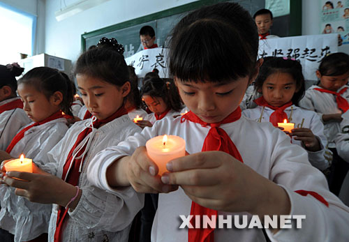 上午7时,四川重灾区青川县的部分救援人员和灾区群众在青川中学举行仪式,缅怀在地震灾害中的遇难同胞。地震幸存者——乔庄小学六年级学生王祥锚、许月桥,用稚嫩的童声表达了他们的哀悼之情。