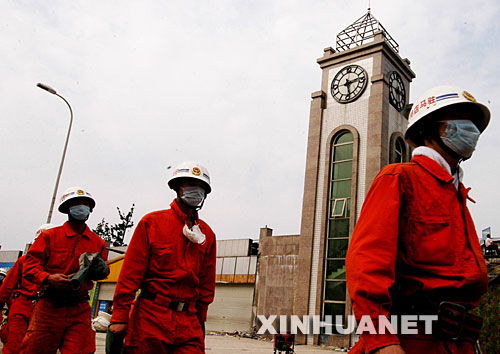 在四川省绵竹市汉旺镇拍摄的钟楼,钟表指针定格在14时28分(