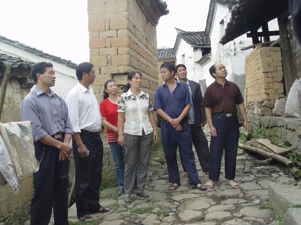 图为乡村干部走村入户排查灾情
