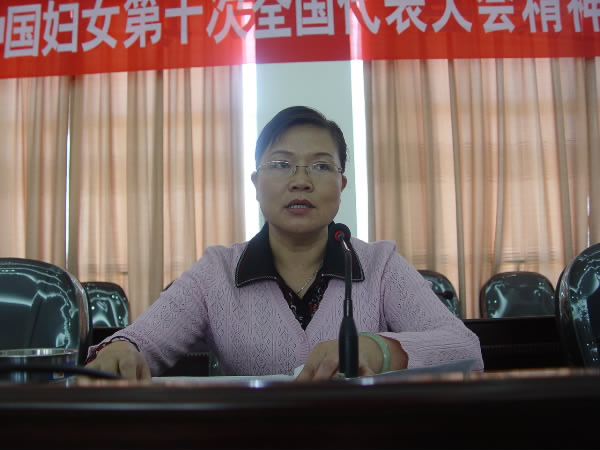 图为:州妇联主席刀红艳传达中国妇女第十次全国代表大会精神