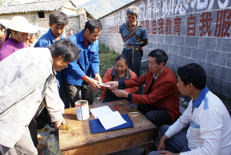 图为在平山乡勐蚌村县野生动物保护办公室工作人员把补偿金发放到群众中