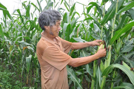 图为农科人员正在细心观察玉米生长情况(曹先贵 摄)