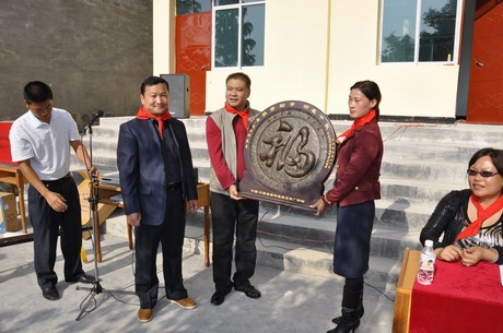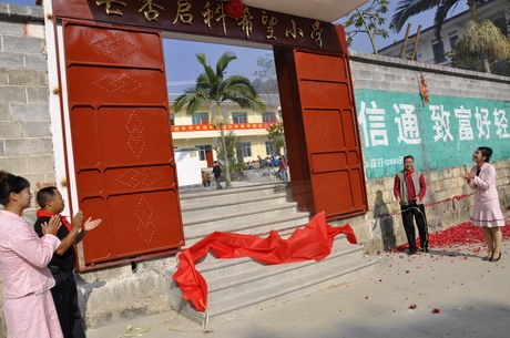 县委常委、宣传部长梁照佩与朱启科先生为新落成的芒杏启科希望小学大门揭牌