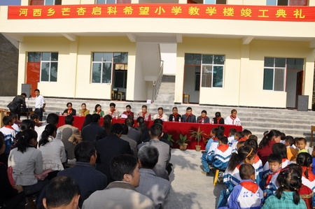在11月4日举行的教学楼竣工落成典礼上,县委常委、副县长陈留英代表梁河县委、县政府讲了话,对深圳格诺实业有限公司捐资助教行动表示感谢。州委宣传部常务副部长、州文明办主任方桄明代表州委宣传部全体干部职工对芒杏启科希望小学教学楼的竣工落成表示热烈的祝贺。他说,芒杏启科希望小学教学楼的竣工落成是各方面支持帮助的结果,凝聚着各级党委、政府的希望和社会各界的爱心,希望更多的社会爱心人士以朱启科先生为榜样,踊跃投身到教育事业;希望学校老师们勤奋工作,不负众望,办好人民满意的教育;希望同学们珍惜良好的学习机会,刻苦学习,成为全面发展的栋梁之才。学生代表表示,将铭记他人的关心和帮助,刻苦学习,奋发向上,以优异的成绩回报各级领导和各爱心人士对他们的关怀和帮助。活动仪式上,州委宣传部、州文明办向芒杏启科希望小学捐赠了1台电脑;梁河县委、县政府向朱启科先生赠送了一份刻有“捐资助学,功在千秋”的纪念品,县委常委、宣传部长梁照佩与朱启科先生为新落成的芒杏启科希望小学大门揭牌。