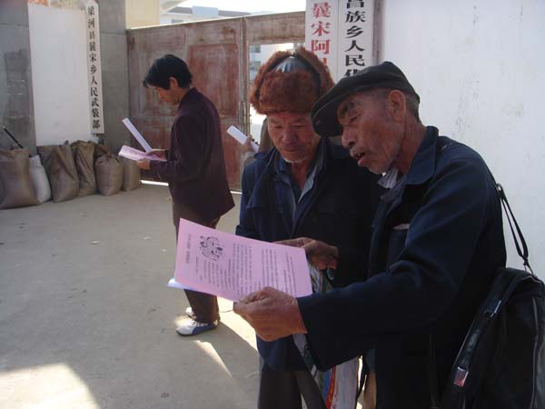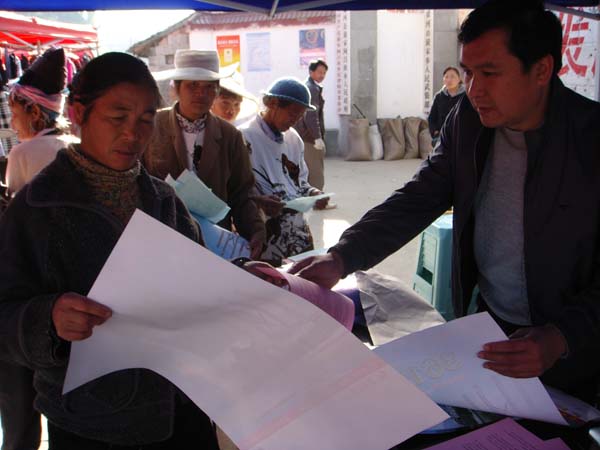 图为工作人员向群众散发宣传材料
