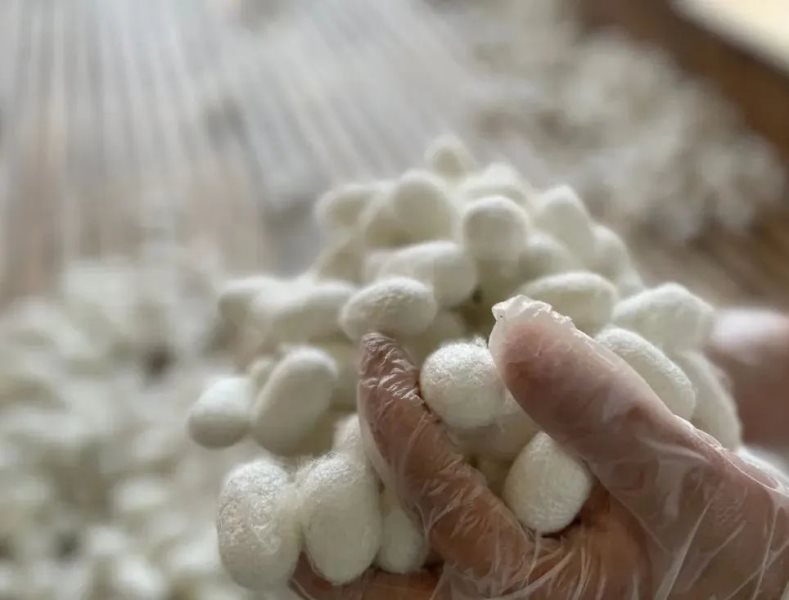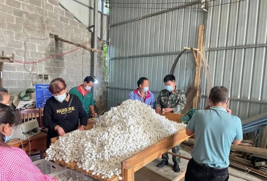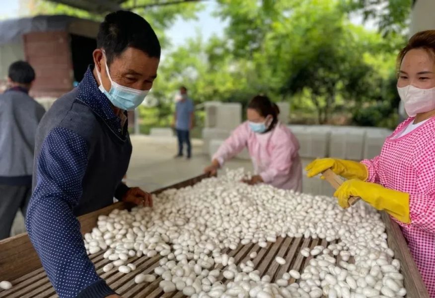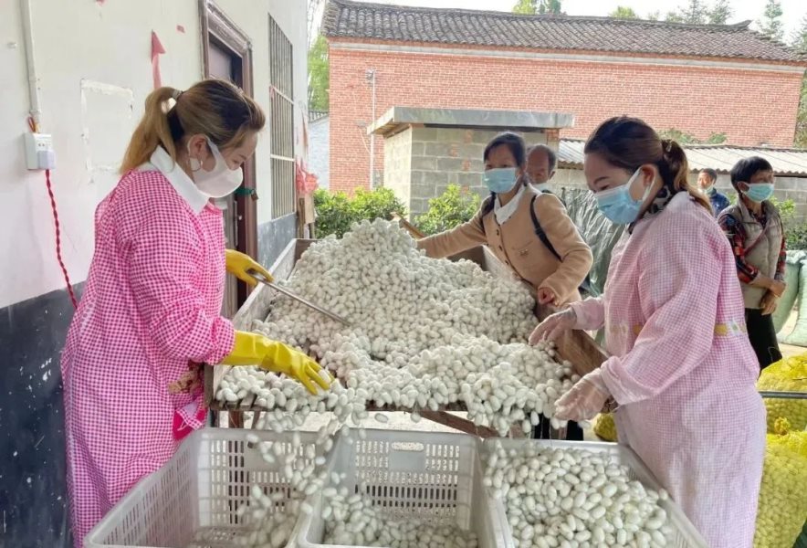 “日晴桑叶绿宛宛,春蚕忽忽都成茧”。白花花的蚕茧犹如洁白的鸽子蛋,如雪似霜、细如发丝、煞是喜人。络绎不绝送蚕茧的蚕农、蚕桑基地收购点的工作人员不断重复着验货、过秤、记账、结算,现场忙碌而有序。