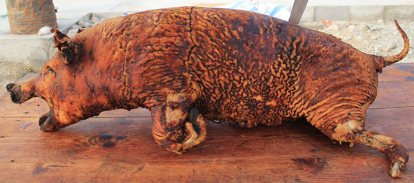 宰杀20—45斤的小猪一头,净其毛和内脏后,取山茅草用传统方法反复烘烤,当其皮金黄而不烂,肉香嫩而不焦,即告烤成,冷却片刻,便可切食。食时,将火烧肉切成碎片,选上将酸醋或酸水,佐以精制调料蘸食之。