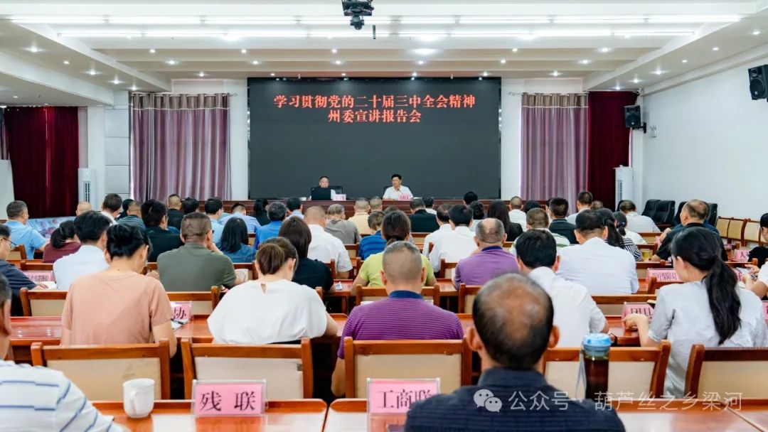 9月25日,学习贯彻党的二十届三中全会精神州委宣讲团报告会在梁河举行。州委宣讲团成员,州委党史研究室主任王伟作宣讲报告。县委副书记、县长何胜富主持报告会。