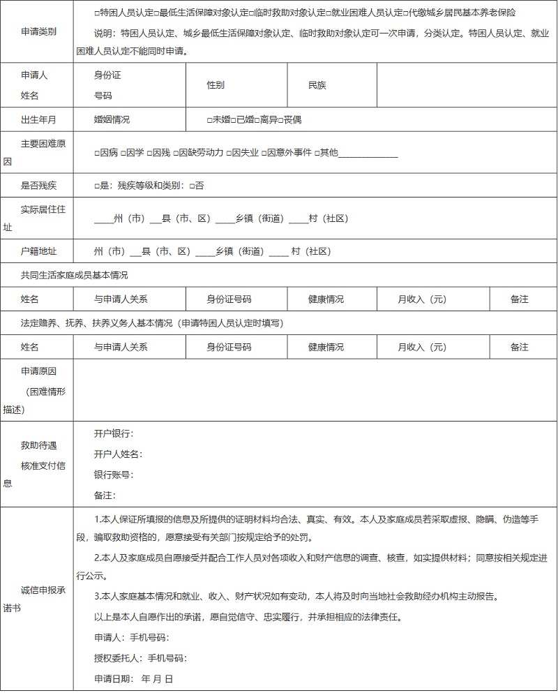 特困人员认定、城乡最低生活保障对象认定、临时救助对象认定可一次申请,分类认定。特困人员认定、就业困难人员认定不能同时申请。