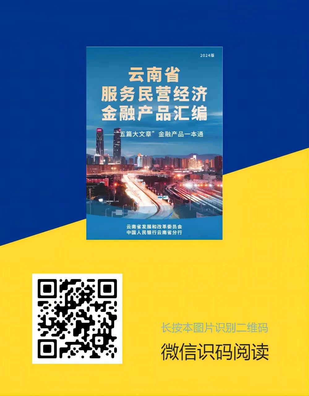 为深入贯彻党中央、国务院关于促进民营经济发展壮大的决策部署,落实中国人民银行等8部门《关于强化金融支持举措 助力民营经济发展壮大的通知》和《中共云南省委 云南省人民政府关于加快民营经济高质量发展的意见》,持续优化金融服务,畅通民营企业金融产品获取渠道,云南省发展和改革委员会、中国人民银行云南省分行组织云南省银行机构梳理了云南省服务民营经济金融产品汇编,分科技金融、绿色金融、普惠金融、养老金融、数字金融五个板块,对有关金融产品的适用对象、准入条件、所需材料、贷款金额、期限利率、担保方式、还款方式、银行机构联系方式等进行了逐一介绍。民营企业如有融资需求,可扫描下方二维码或者点击下方链接获取信贷产品信息和联系方式,直接咨询了解。