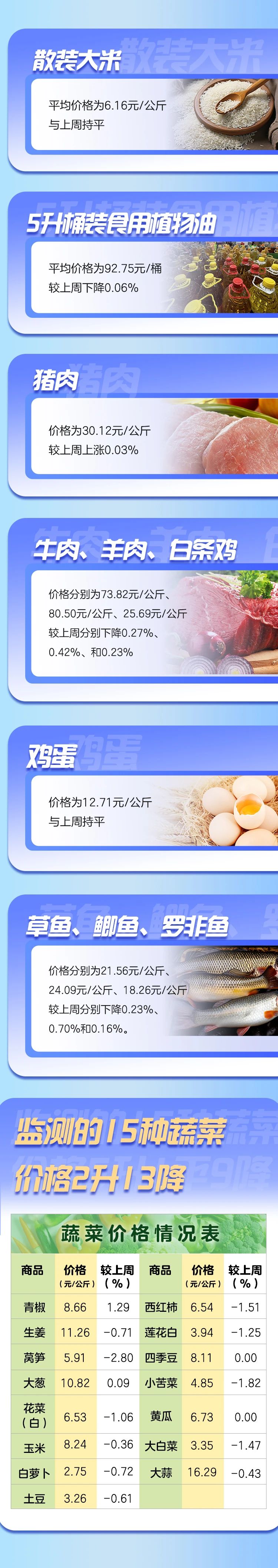 从云南省发展改革委重要民生商品零售价格监测数据看,与上周相比,本周全省粮食、鸡蛋价格(全省平均价格,下同)持平,猪肉价格略涨,牛肉、羊肉、鸡肉、蔬菜、淡水鱼、食用植物油价格下降。