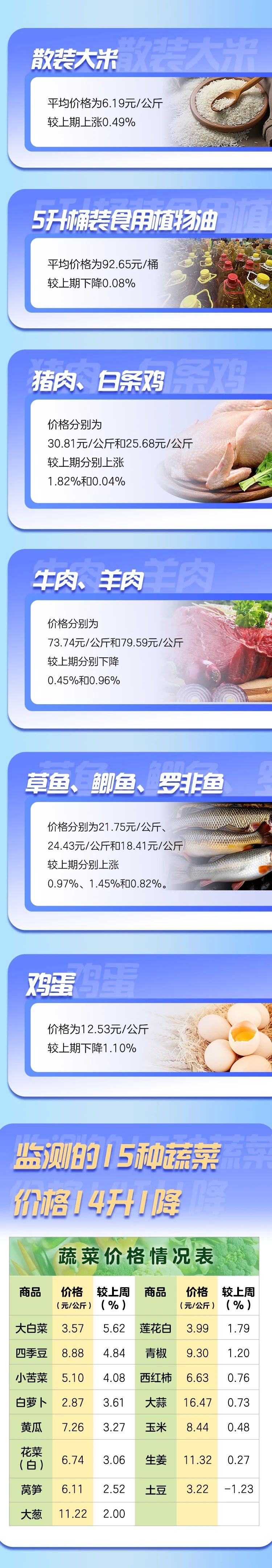 从云南省发展改革委重要民生商品零售价格监测数据看,与2025年1月22日(上期)相比,本周全省粮油价格(全省平均价格,下同)总体稳定,猪肉、白条鸡、蔬菜、淡水鱼价格上涨;牛肉、羊肉、鸡蛋价格下降。
