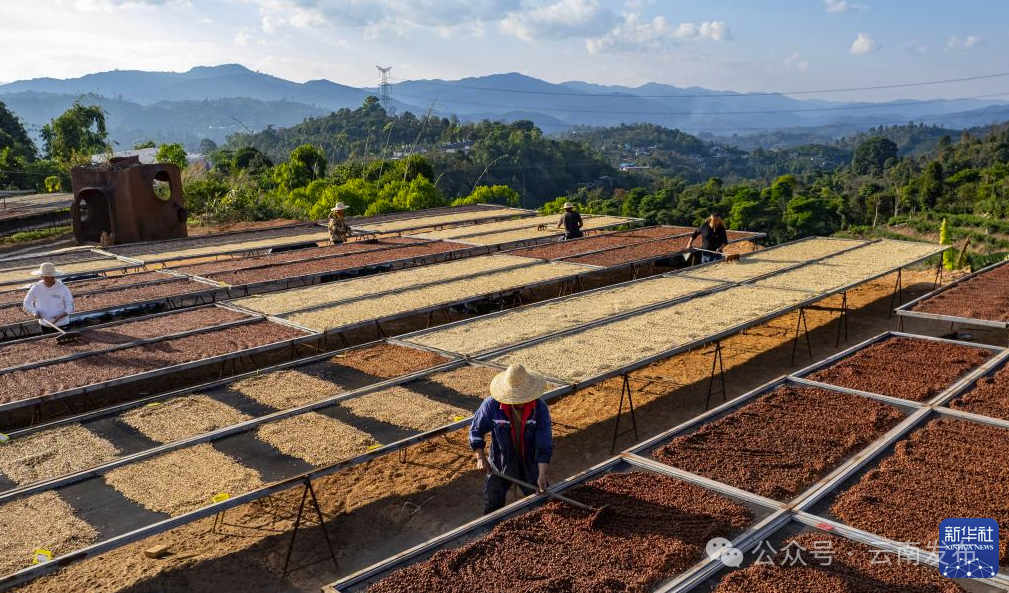 工作人员在普洱市思茅区大开河梅子咖啡庄园的咖啡晒场翻晒咖啡 图源:新华社 陈欣波 摄