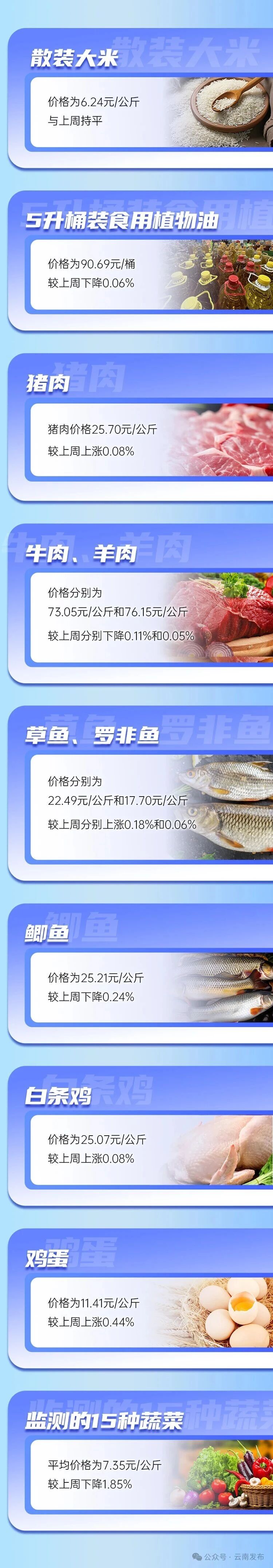 从云南省发展和改革委员会重要民生商品零售价格监测数据看,与上周相比,本周全省粮、油、肉、蛋、菜价格(全省平均价格,下同)总体平稳