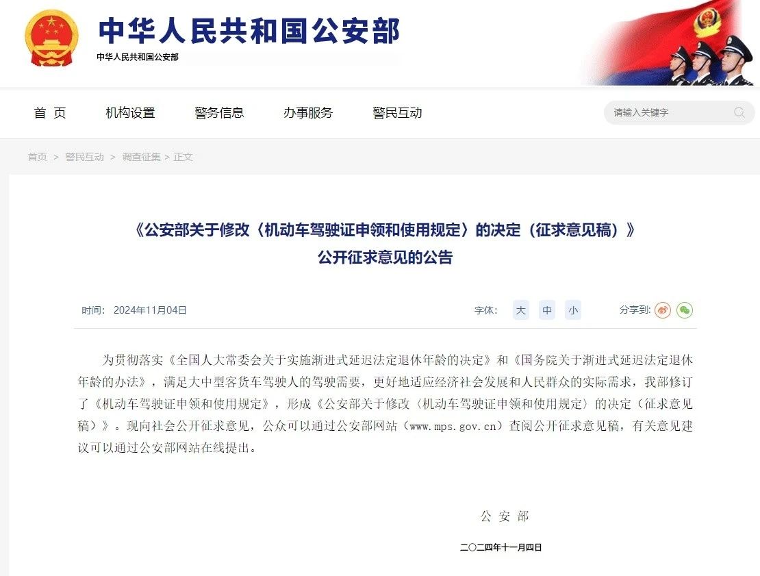 今年9月,十四届全国人大常委会第十一次会议审议通过《关于实施渐进式延迟法定退休年龄的决定》,批准《国务院关于渐进式延迟法定退休年龄的办法》。为贯彻落实上述规定,满足大中型客货车驾驶人的驾驶出行需求,更好地服务于客货运市场发展,公安部广泛听取社会群众、人大代表、政协委员、相关部门、行业企业等意见建议,修改完善形成此次公开征求意见稿。