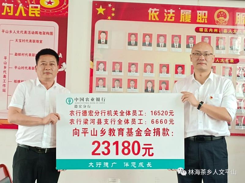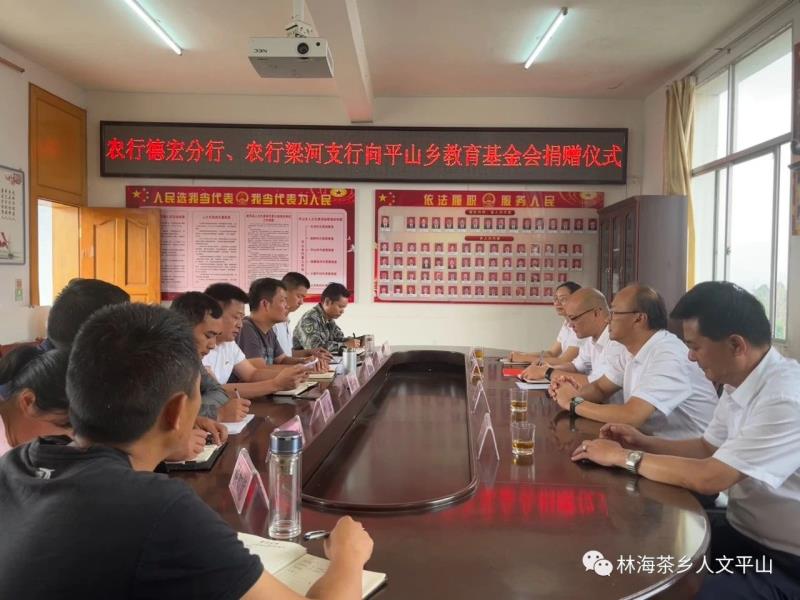 情系教育,奉献爱心。为践行企业社会责任,传递公益精神,5月10日,农行德宏分行、农行梁河支行到平山乡开展爱心捐赠活动,与平山乡党政领导班子进行了座谈交流,向平山乡教育基金会捐赠资金23180元。州农行党委书记段文斌,党委委员、副行长范云刚,梁河农行党委书记、行长李娜,平山乡党政领导班子,天宝村驻村工作队第一书记参加捐赠活动。